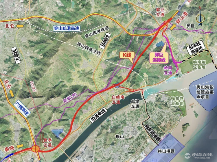 这段高速的起点位于S20穿山疏港高速郭巨互通,改造现状双喇叭互通为枢纽兼落地互通,经紫微岙隧道后,上跨梅山铁路支线,经马盘后设白峰互通与沿海中线及北堤互通相接,经下阳隧道后抵虾腊、干岙,终于S21宁波舟山港六横公路大桥昆亭枢纽。