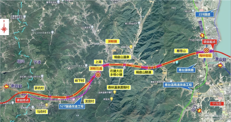 路线自东向西布设,设西店枢纽(下图中为梅林枢纽)接甬台温高速改扩建,上跨甬台温高铁,设雁苍山特长隧道穿至深甽镇,沿既有G527国道南侧布线至上湖村,设深甽互通接规划G527国道深甽至新昌段工程,随后路线向西设隧道群至甬绍界,顺接鄞州至宁海高速西延工程(新昌联络线)。